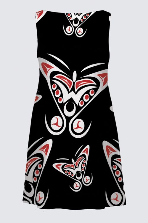 Featuring art by Shar Wilson, Gitxsan Artist, this classic dress is a perfect addition for those special occasions where you want to shine. Think how beautiful you would look at the graduation ceremonies, the weddings, the dinners and gala events!