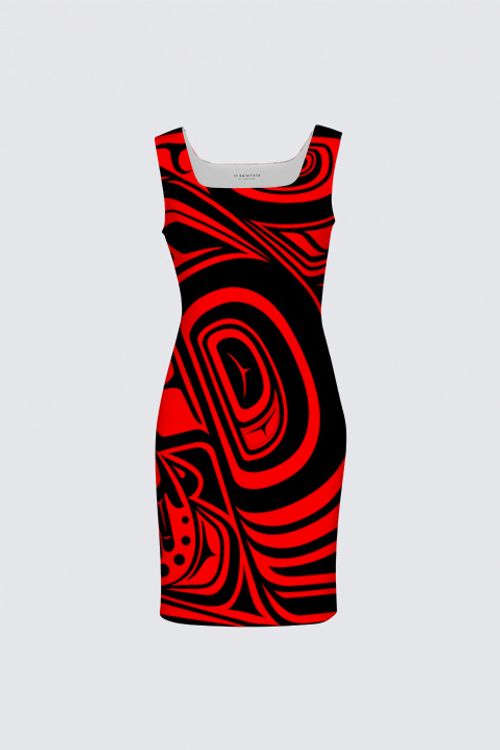 Featuring art by Shar Wilson, Gitxsan Artist, this dress will be a staple in your closet or business overnighter bag. Fashionable square neckline and princess darts make this dress flattering. Scuba fabric is 95% polyester/5% spandex for comfort. Machine washable - great for travelling. To see meaning of artwork go to 'blog' on website.