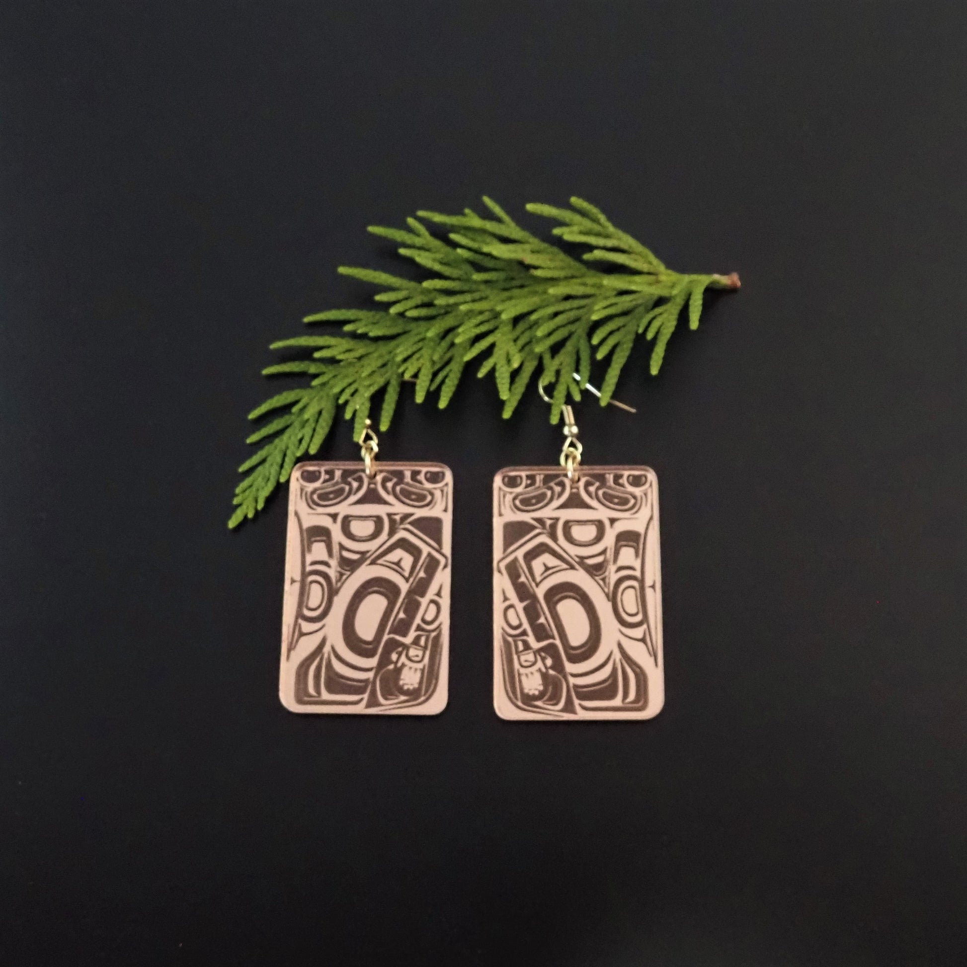 Knowing is the first design I created after learning more and more about our Gitxsan form line. I loved 'knowing'. This design is in a beautiful rose gold. The earring measures 5 cm & the whole earring measure 7.5 cm. This earring wears light & you might forget you are wearing it except for the compliments you will be getting all day long!